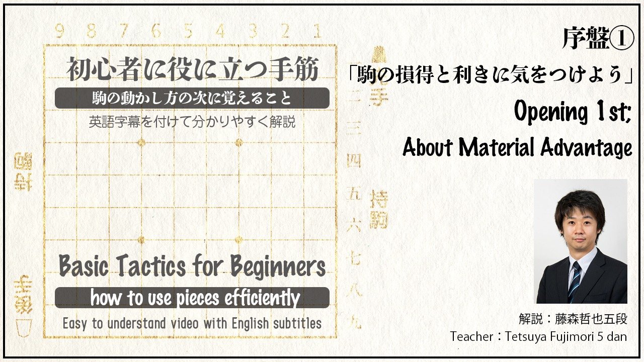 『初心者に役に立つ手筋~駒の動かし方の次に覚えること 序盤編 (全2本)』 ~英語字幕を付けて分かりやすく解説~ 2021年10月16日(土)11時00分 動画の内容 ① 「駒の損得と利きに気をつけよう」 駒にひもをつけるとは? 角の利きに気をつけよう。駒の損得、タダで取られない考え方を覚えよう。無意味な手、損な手を指さないようにしよう。 ② 「四間飛車の指し方」 玉を囲う~四間飛車から美濃囲いへ。王が一番大切な駒なので、安全な場所へ移動しよう。 解説 藤森哲也五段